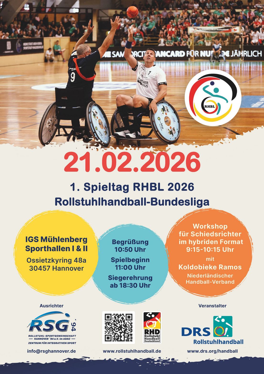 Veranstalter des Spieltags ist der Deutsche Rollstuhl-Sportverband (DRS), ausgerichtet wird der Saisonstart von dem amtierenden Deutschen Meister, den RSG Blue Bandits Hannover. Der Auftakt steht exemplarisch für die sportliche Entwicklung der Bundesliga: zwei neue Teams, mehr Qualität und ein stetig wachsendes Niveau auf dem Spielfeld. Eröffnet wird der Spieltag mit einem gemeinsamen Grußwort von Bürgermeister Thomas Herrmann und der Vorsitzenden des Fachbereichs Rollstuhlhandball im DRS, Dr. Meike Lüder-Zinke. Anschließend rollt der Ball bis in die frühen Abendstunden nahezu ohne Pause.