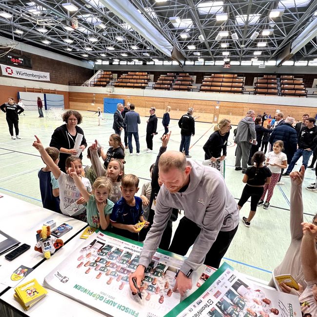 Zum Abschluss wartete ein weiteres Highlight: Die Kinder hatten die Gelegenheit, Fragen an die ehemaligen Bundesligaprofis Manuel Späth (Markenbotschafter FRISCH AUF! Göppingen) und Jens Bürkle (Jugendkoordinator TVB Stuttgart) zu stellen sowie Autogramme und Poster mit nach Hause zu nehmen, was für strahlende Gesichter bei den jungen Nachwuchssportlerinnen und -sportlern sorgte.