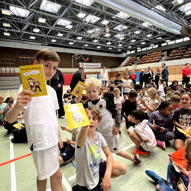 Nach dem praktischen Teil folgte ein besonderer Moment für die Kinder: Die Gäste rund um Theresa Schopper verteilten gemeinsam die kindgerechten Regelhefte an die Zweitklässler. In ihrer kurzen Ansprache lobte die Kultusministerin die eindrucksvollen Teilnehmerzahlen und betonte die Bedeutung regelmäßiger Bewegung im Alltag junger Menschen. Sie ermutigte die Schülerinnen und Schüler, weiterhin aktiv zu bleiben und vielleicht sogar dauerhaft den Weg in den Vereinssport zu finden.