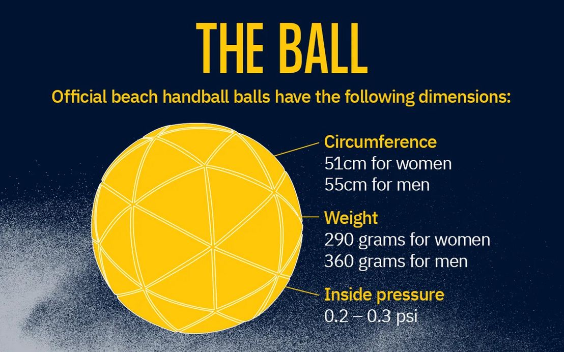 Alle Spieler sind barfuß und spielen mit einem luftgefüllten PVC-Ball in der Größe eines Hallenhandballs (Männer: 54 – 56 cm Umfang und 350 - 370 g Gewicht; Frauen 50 - 52 cm Umfang und 280 - 300 g Gewicht). Das Hechten nach einem liegenden oder rollenden Ball ist erlaubt. Der Ball darf nicht länger als drei Sekunden am Boden liegen und von dem Spieler, der ihn zuletzt berührt hatte, wieder aufgenommen werden. Alle Würfe können unmittelbar zu einem Tor führen (Ausnahme bei Schiedsrichterwurf).