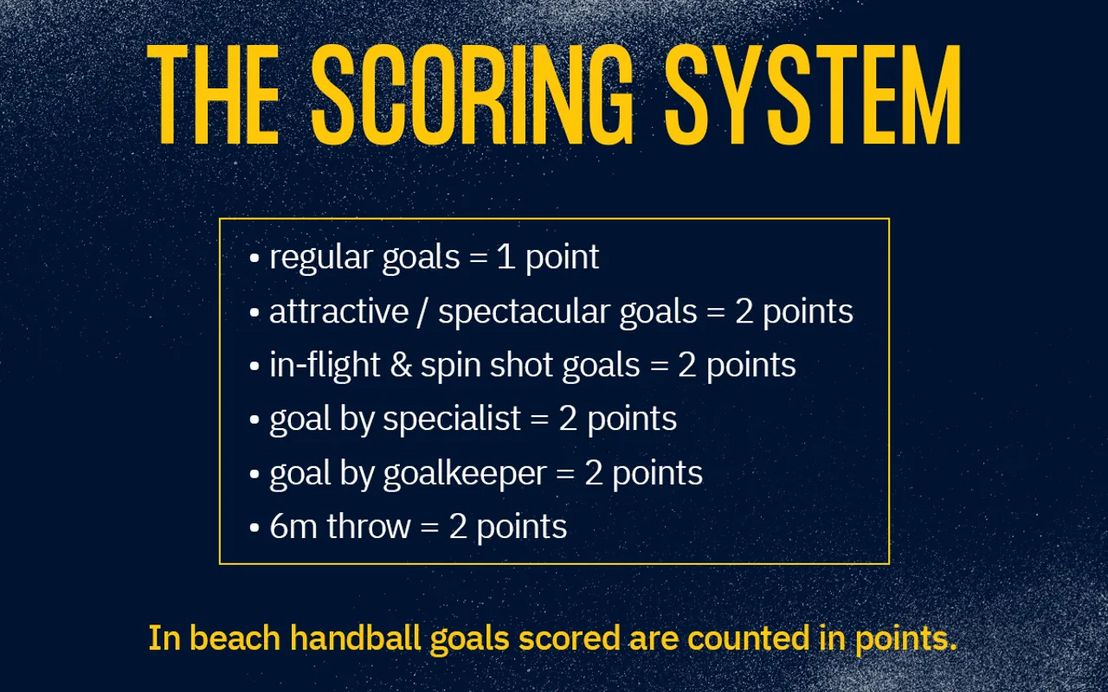 Ansonsten gelten die Hallenhandball- Regeln der IHF mit Abänderungen in der Punktwertung, wobei Torhütertreffer und spektakuläre Würfe, wie z.B. Kempa-Treffer (den Ball im Sprung fangen und werfen) oder „Spinshots“ (Wurf nach 360-Grad-Drehung) mit Zusatzpunkten gewertet werden. Außerdem gibt es beim Torerfolg eines Sechs-Meter-Wurfes einen Zusatzpunkt.