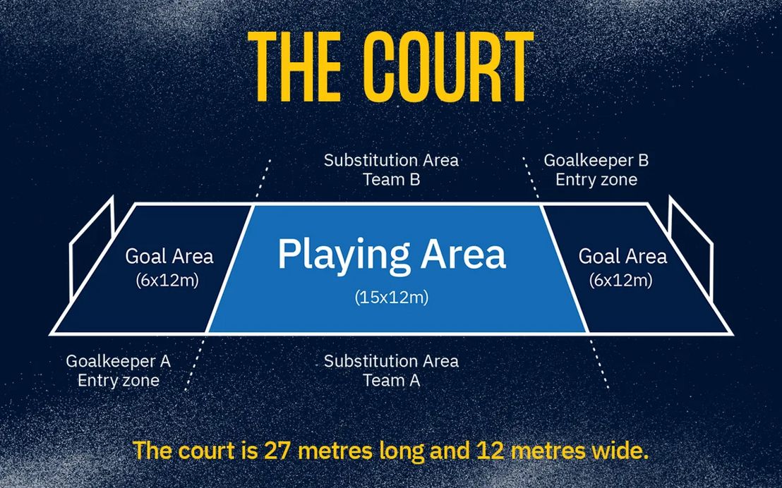Die Längsseiten des Spielfeldes sind die Seitenlinien, die Breitseiten heißen Torauslinien. Die gesamten Seitenlinien des Spielfeldes stellen die Auswechselzone für die Feldspieler dar, und zwar wird in beiden Sätzen auf derselben Seite ausgewechselt, lediglich die Spielrichtung wird bei Halbzeit gewechselt.