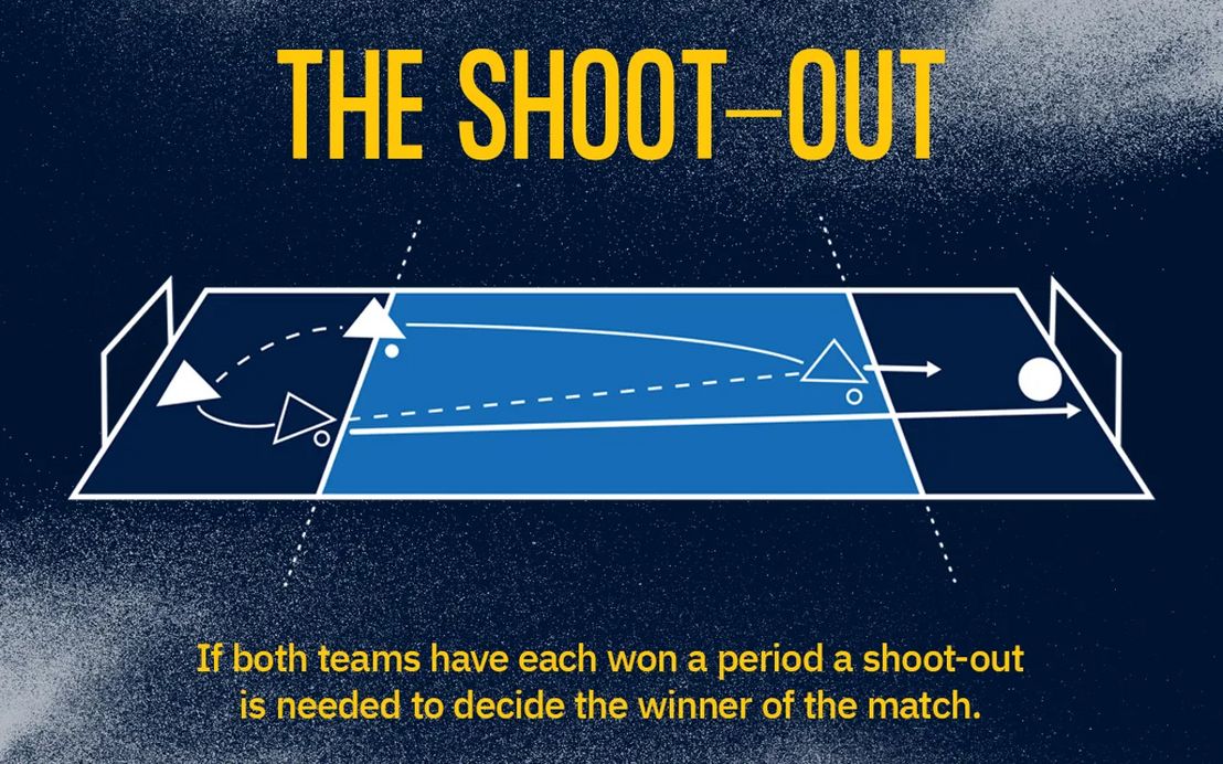 Wenn beide Sätze von derselben Mannschaft gewonnen werden, ist diese mit 2:0 Punkten Gesamtsieger. Gewinnt je eine Mannschaft einen Satz, wird der Sieger durch „Einer gegen den Torwart“ (Shoot-Out) ermittelt. Der Sieger des Shoot-Out erhält 1:0 Punkte; er gewinnt das Spiel also mit 2:1 Punkten.